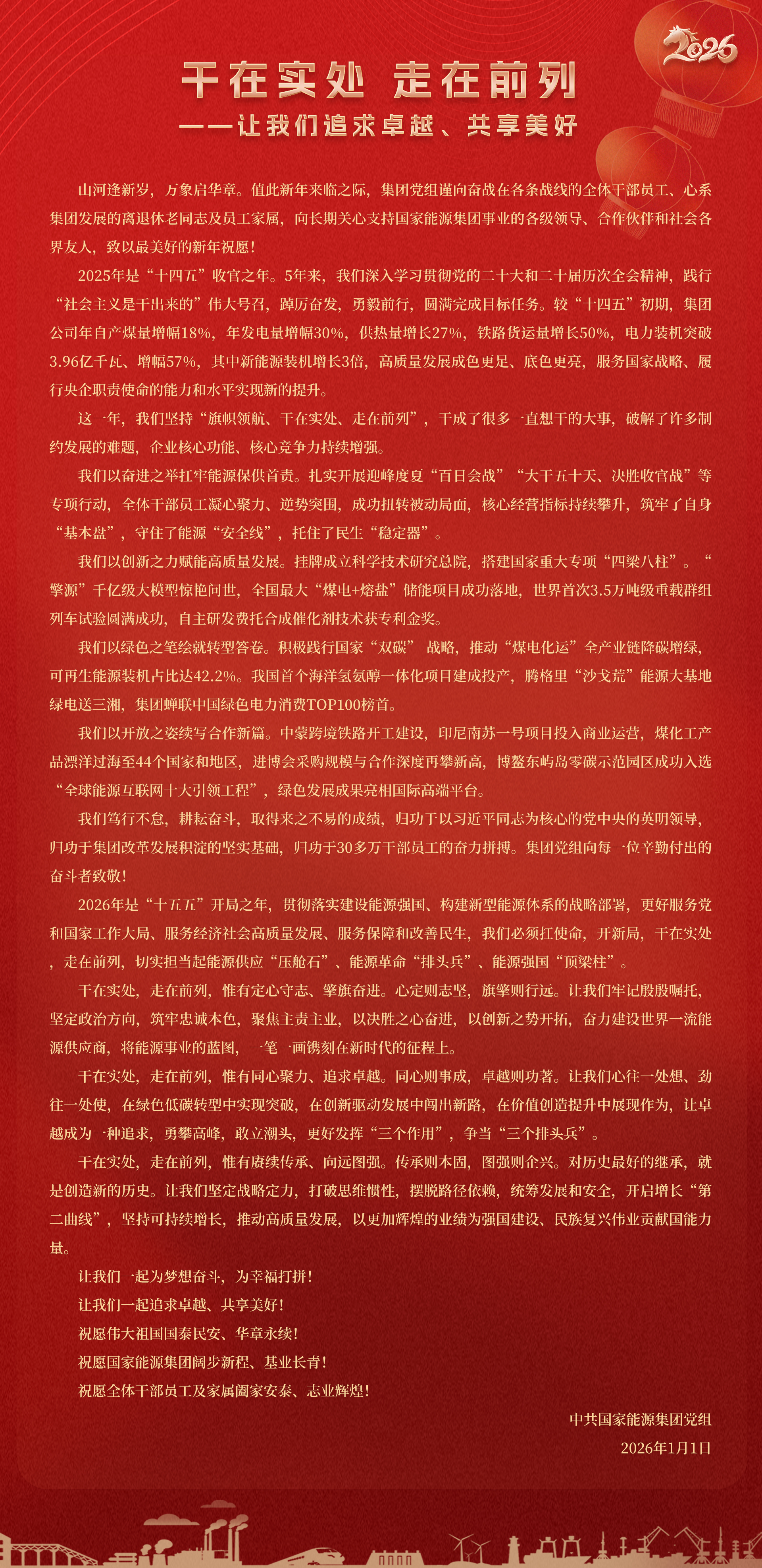 國(guó)家能源集團(tuán)胸懷“國(guó)之大者”,增產(chǎn)增供、穩(wěn)價(jià)穩(wěn)市,積極服從服務(wù)國(guó)家戰(zhàn)略、保障國(guó)家能源安全、助力國(guó)民經(jīng)濟(jì)穩(wěn)增長(zhǎng),推動(dòng)煤炭安全綠色智能、煤電清潔高效穩(wěn)定、現(xiàn)代煤化工高端多元低碳、運(yùn)輸物流協(xié)同一體、新能源多元?jiǎng)?chuàng)新規(guī)模化發(fā)展,全力擔(dān)當(dāng)能源強(qiáng)國(guó)頂梁柱,能源供應(yīng)壓艙石,能源革命排頭兵。